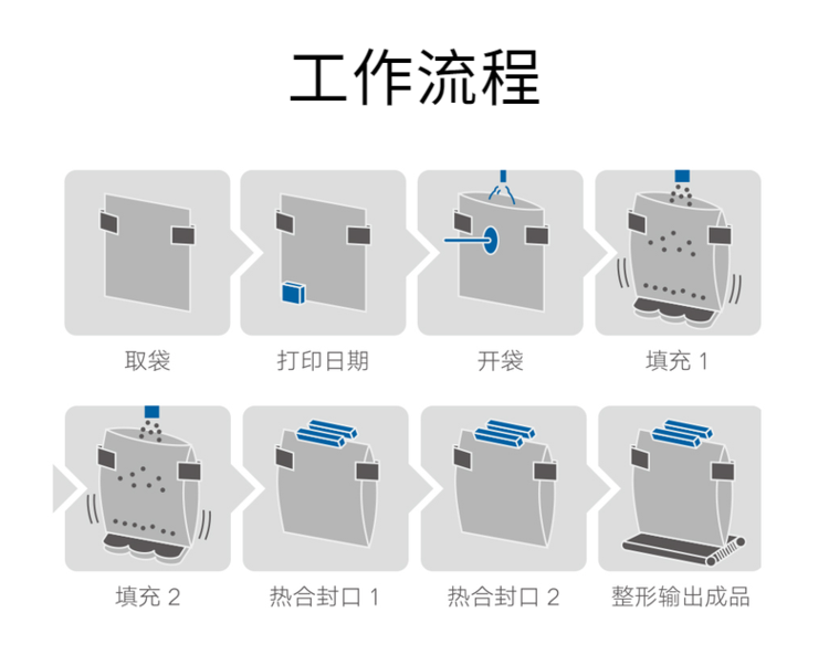 主要標準部件:上袋系統(tǒng)、開拉鏈系統(tǒng)、開袋裝置、下料系統(tǒng)、熱封系統(tǒng)、PLC系統(tǒng)、輸出系統(tǒng)