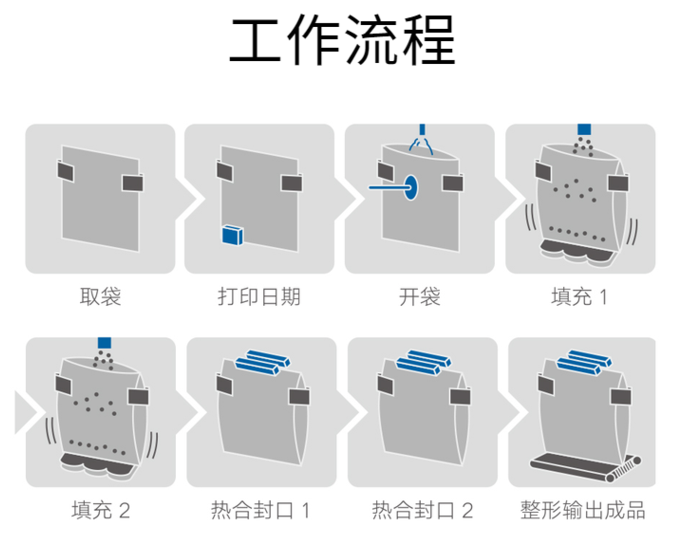 上袋系統(tǒng)、PLC控制系統(tǒng)、開袋裝置、下料系統(tǒng)、清理系統(tǒng)、轉接系統(tǒng)、熱封控制系統(tǒng)、輸出系統(tǒng)