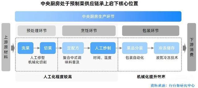 上游原材料先進(jìn)行清洗,機(jī)械化切菜,各種菜品運(yùn)送到下一步進(jìn)行調(diào)味,人工炒制。最后通過(guò)預(yù)制菜包裝機(jī)進(jìn)行全自動(dòng)包裝,再由液氮急速冷凍保存。最后就到了消費(fèi)者的手里。